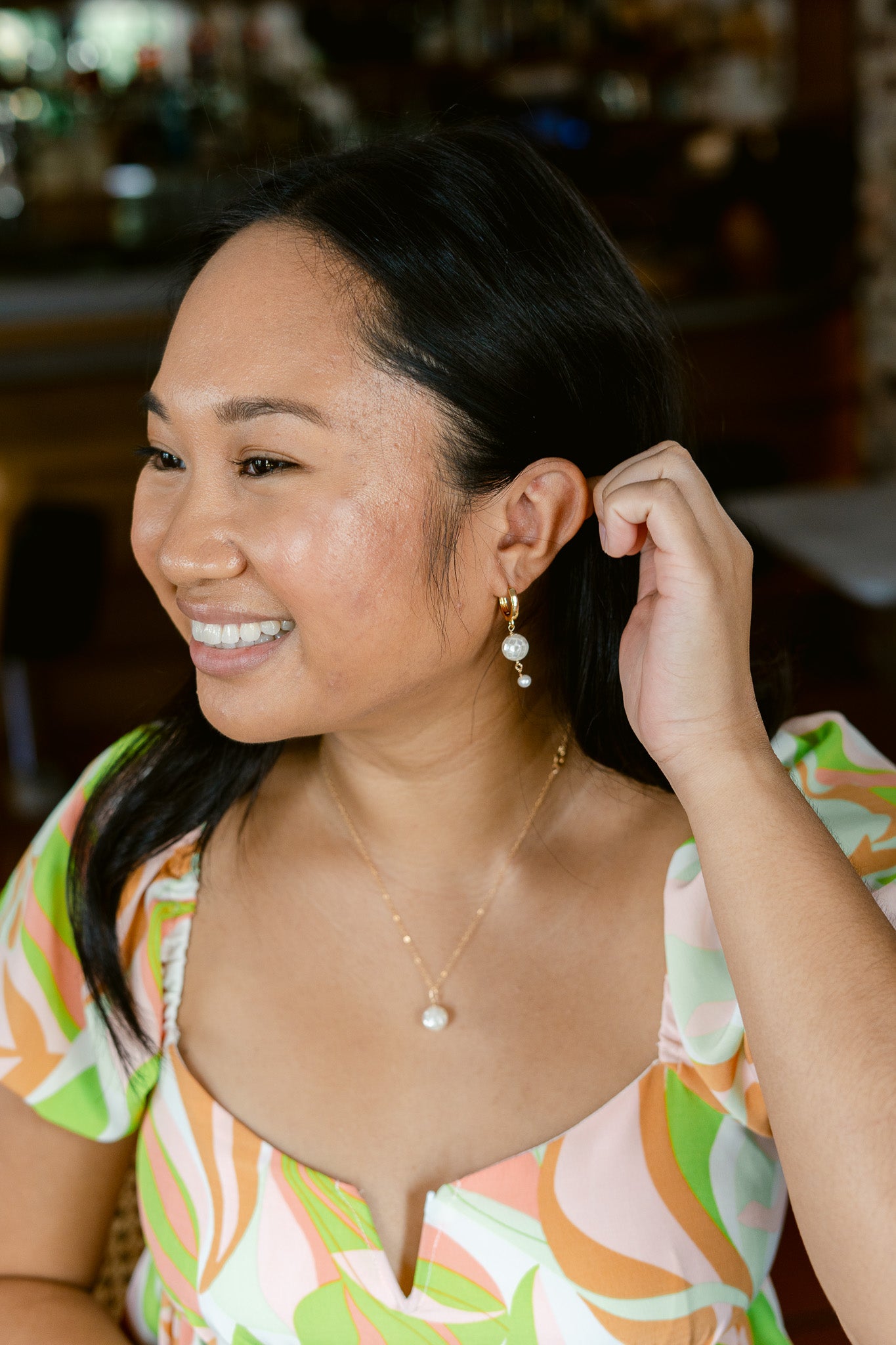 Add a sparkling twist to your look with the Disco Queen Earrings. Featuring shimmering mother of pearl disco balls suspended from elegant gold hoops, these earrings bring playful retro vibes and a touch of glam to any outfit. Perfect for dancing the night away or brightening up your everyday style!