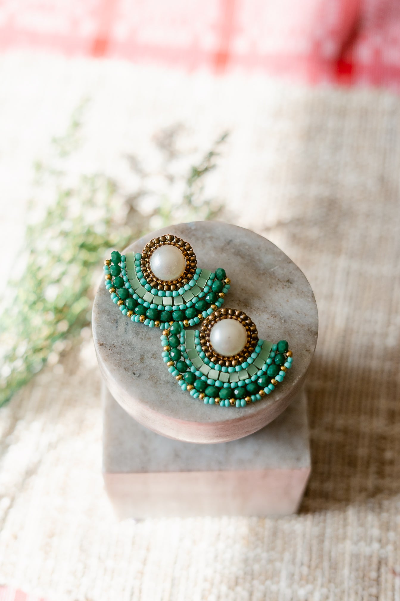 Enhance your look with Luna Earrings. These statement earrings feature a stunning fan shape and are hand beaded with emerald, green, and sage colors. Elevate any outfit with these unique and eye-catching accessories.