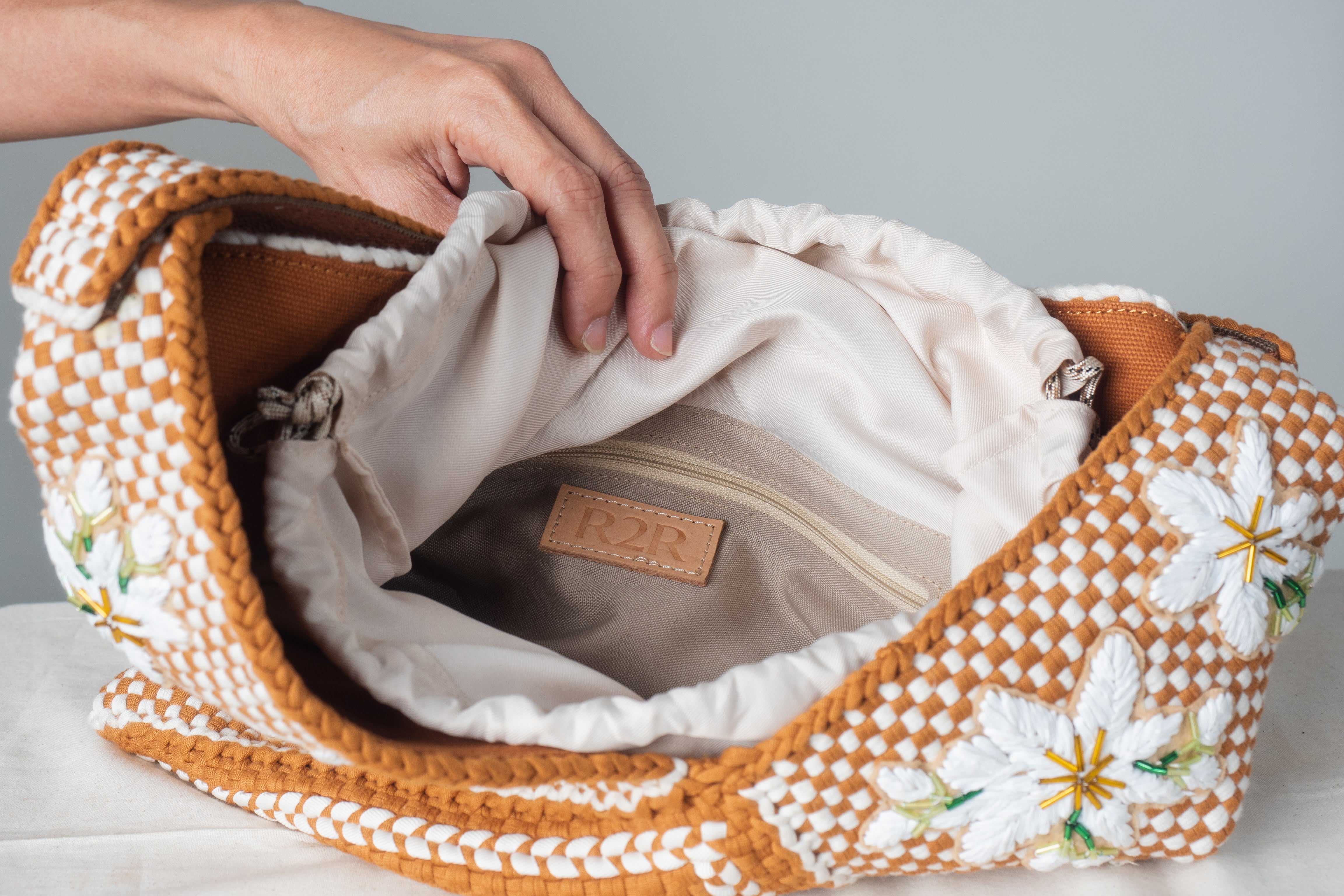 - Signature R2R weave handwoven with upcycled fabric by the R2R artisans