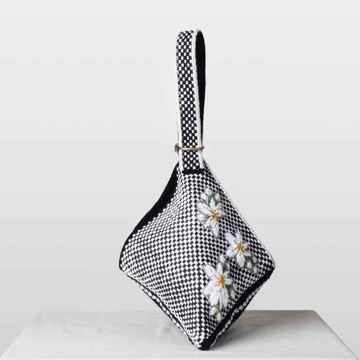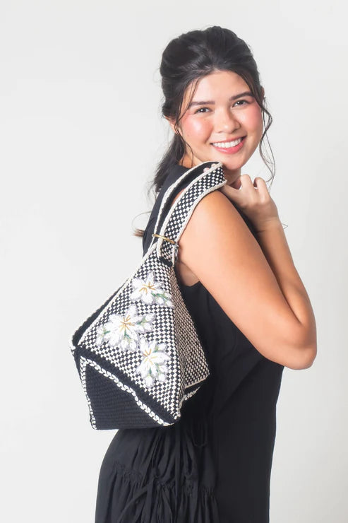 - Hobo in checkered woven strap & body panel with Sampaguita embroidery in raffia; solid color woven base with grosgrain ribbon inserts.