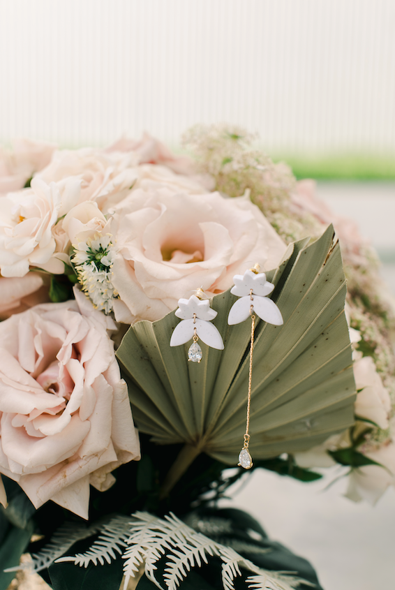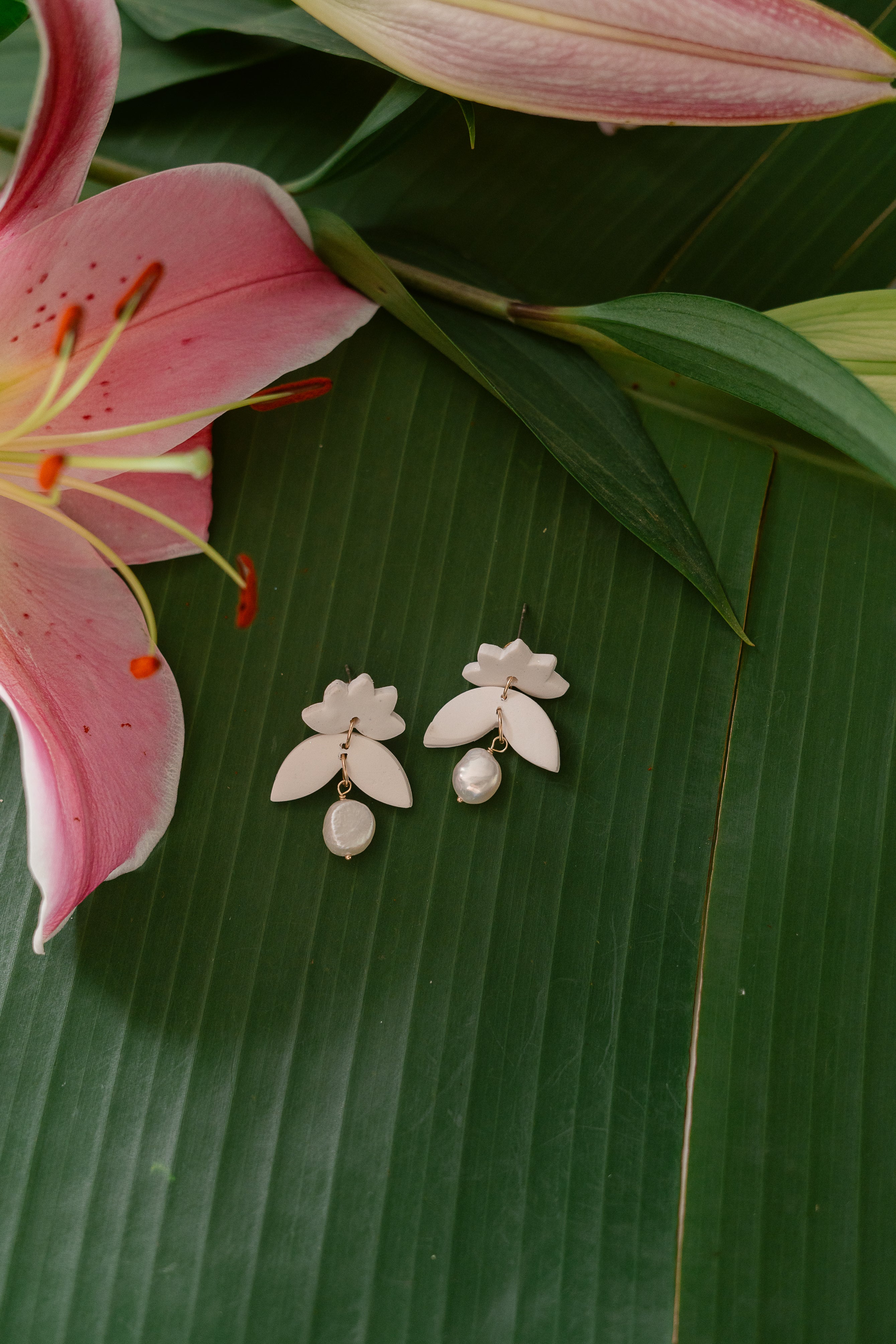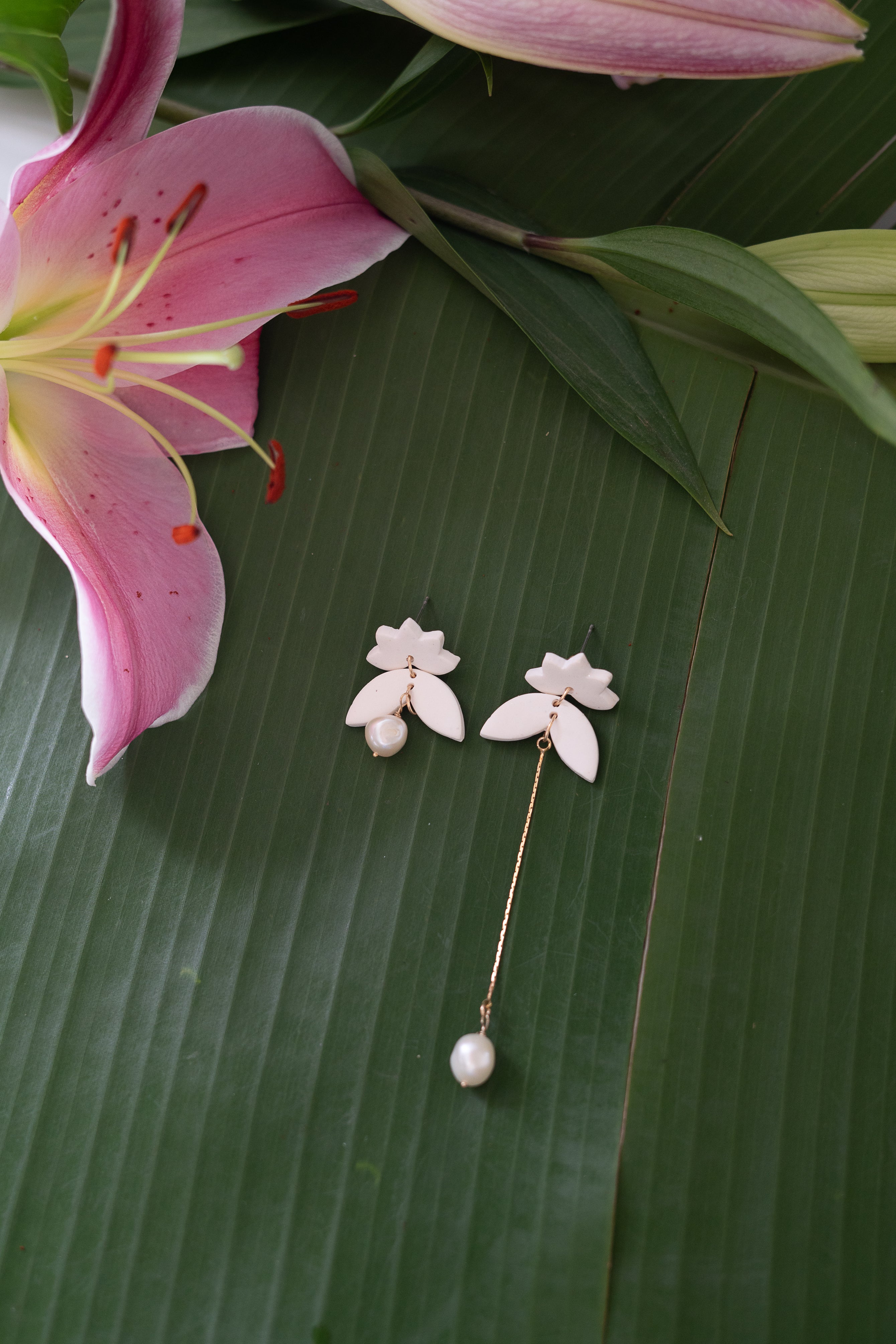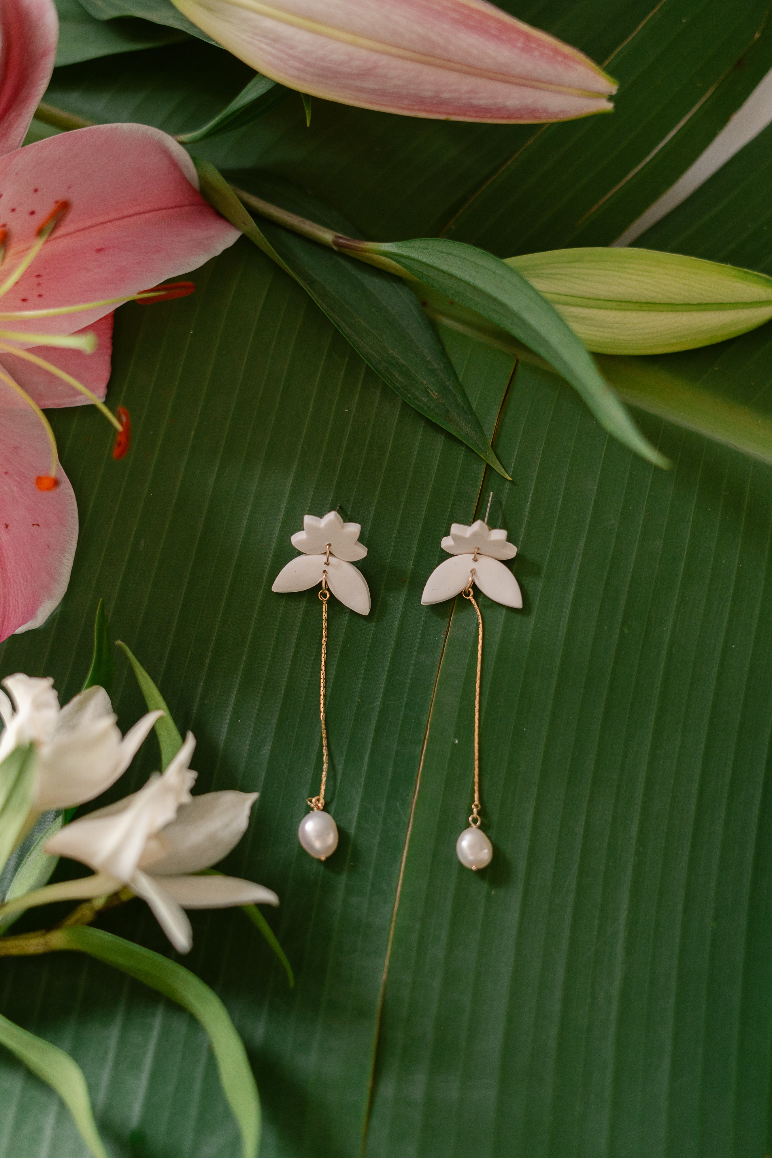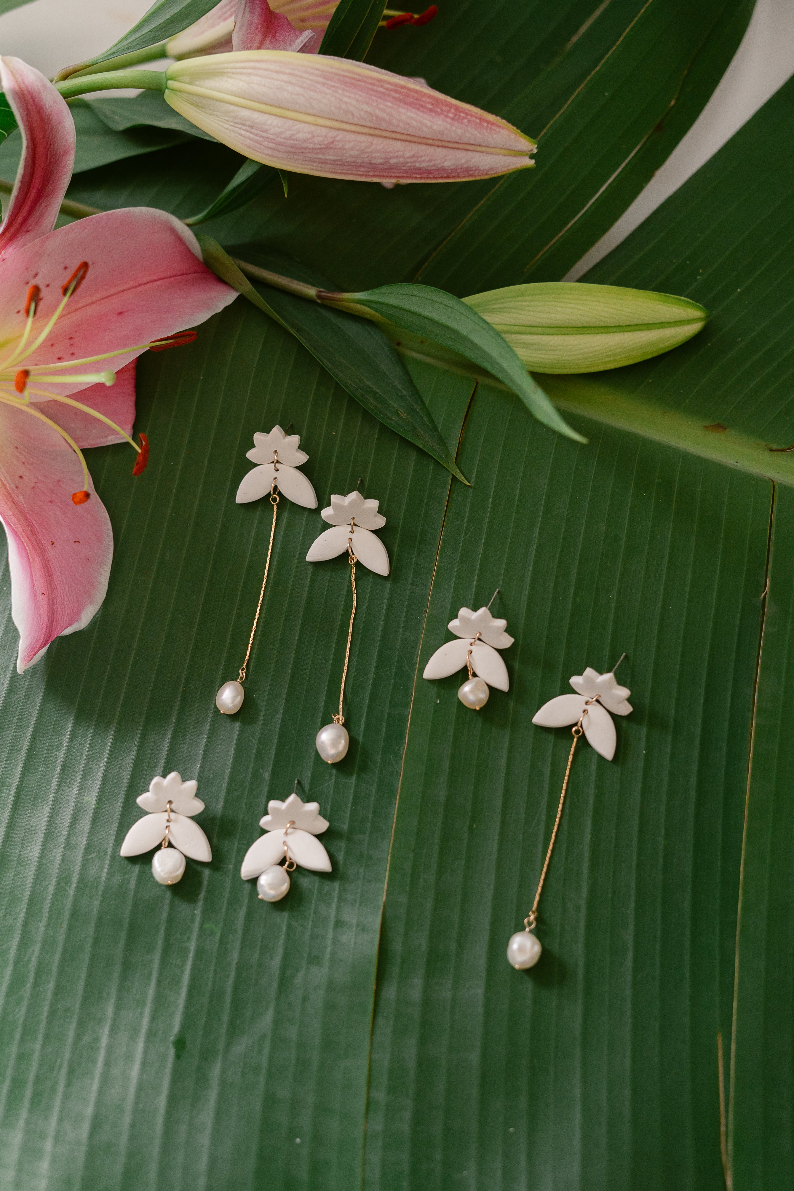 These Pangako earrings, designed by LAROWAN & Dreaming of Clay Founder Jea Tang, are inspired by her wedding flowers. "Pangako" means promise. They come in three stunning styles - asymmetric (original), double studs or double dangle.