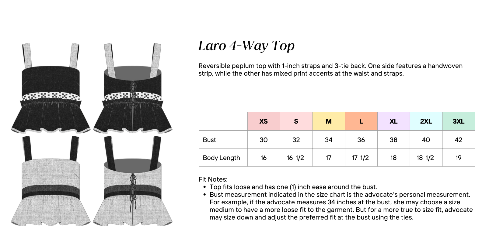 The Laro 4-Way Peplum Top lets you play dress-up in four different ways (or more!) and features coquettish ribbons, a flattering peplum silhouette, and a woven strip detail on one side that our artisans made to mimic signature R2R weave. This multi-way reversible top has 4 initial ways to wear it: