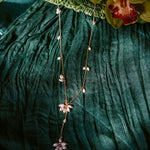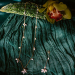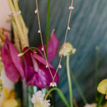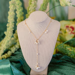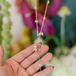 The Maria is a statement asymmetrical lariat necklace that pairs beautifully with the Kaulana or Anela earrings. Hand-wrapped freshwater white seed pearls scattered along a dainty 14K gold-filled chain.